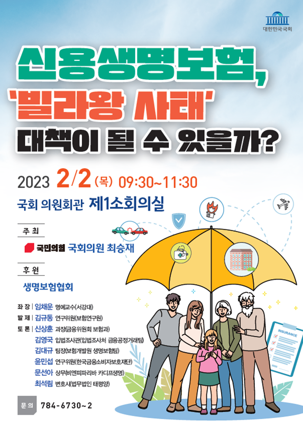 최 의원은 “빚의 대물림 문제와 빌라왕 사태, 고금리에 따른 가계부담 증가 등 민생 문제 해결 방안을 모색하고자 토론회를 기획했다”고 밝히며, 대출고객이 사망 등으로 빚을 갚지 못하게 될 경우 보험사가 약정한 금액을 대신 상환하는 신용생명보험을 통해 고금리 시대 대출고객의 미상환 위험을 줄이고, 금융기관의 부실채권을 관리하며, 나아가 거시적 관점에서도 국가경제의 건전성을 확보할 수 있을 것이라고 주장했습니다.
